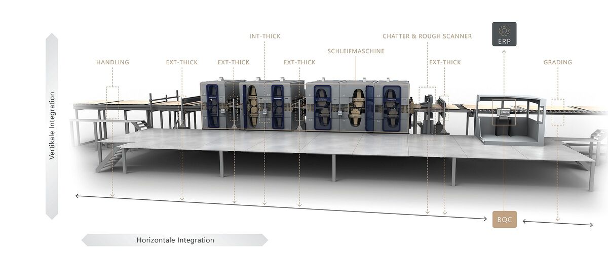 Voraussetzung war die Einbindung von Maschine und BQC in die umliegende Systemlandschaft – die horizontale und vertikale Integration von der Dickenmessung bis zum ERP-System. Auf Grundlage dieser Datenbasis kann nun zusätzlich zur Funktion der automatischen Maschinenvoreinstellung ein automatisierter Kalibrierprozess durchgeführt werden. Per Sensorik und statistischen Methoden wird permanent die Abweichung von Plattendicke und Parallelität ermittelt sowie eine optimale Maschineneinstellung berechnet. Die neuen Informationen werden auf die Steuerung übertragen. Daraufhin kalibriert sich die Maschine, ohne dass der Operator in den Prozess eingreifen muss.